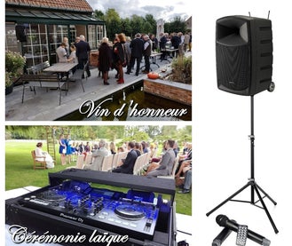 Confiez-nous la sonorisation de votre vin d’honneur ou de votre cérémonie laïque, qu’elle se déroule en intérieur ou en extérieur. Nous mettons à votre disposition une enceinte ainsi que deux micros sans fil. Cette prestation inclut également la présence d’un DJ, qui se chargera de diffuser vos musiques et d’assurer la gestion des micros, pour une ambiance parfaitement maîtrisée. (sous certaines conditions)